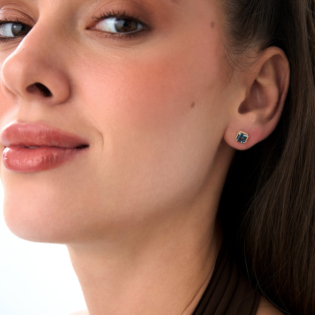 14K Asscher Cut London Blue Topaz Stud Earrings