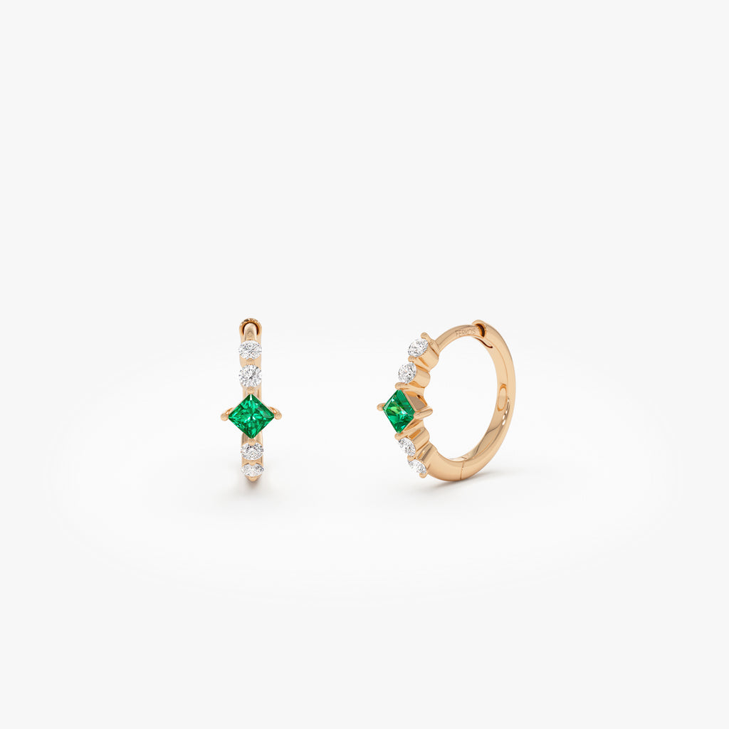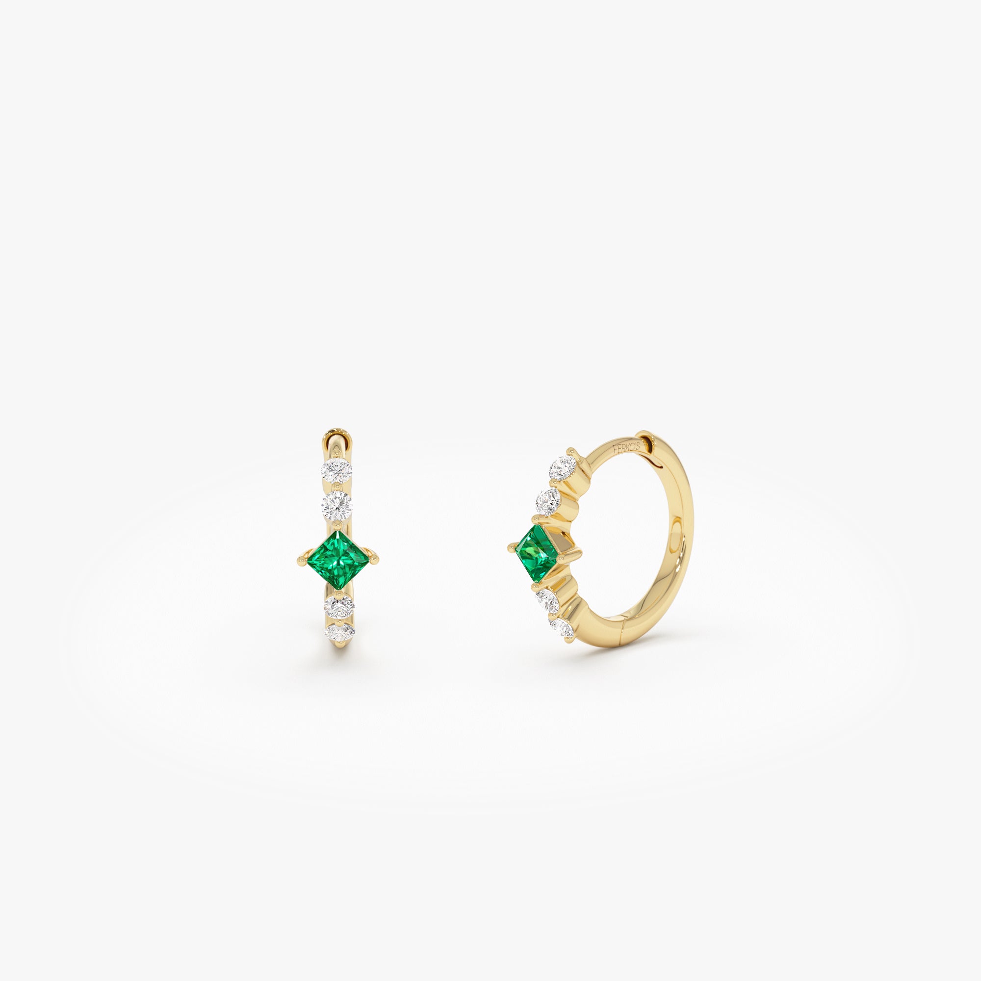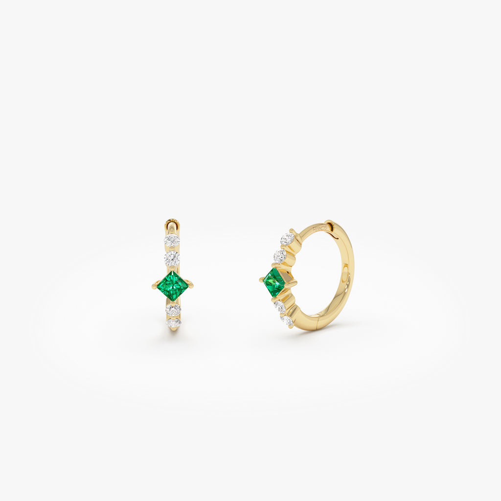 14k Princess Cut Emerald and Diamond Hoop Earrings