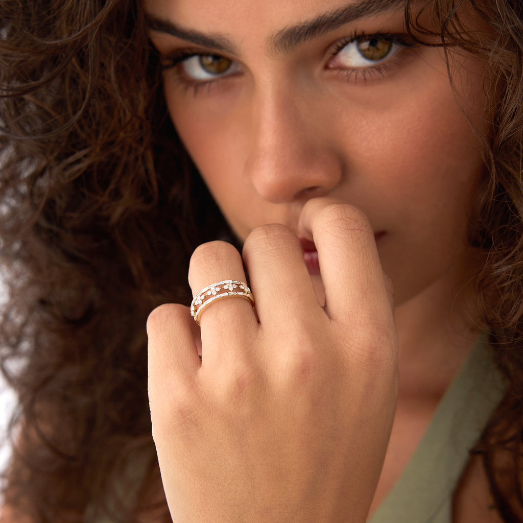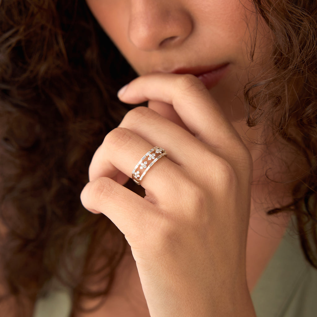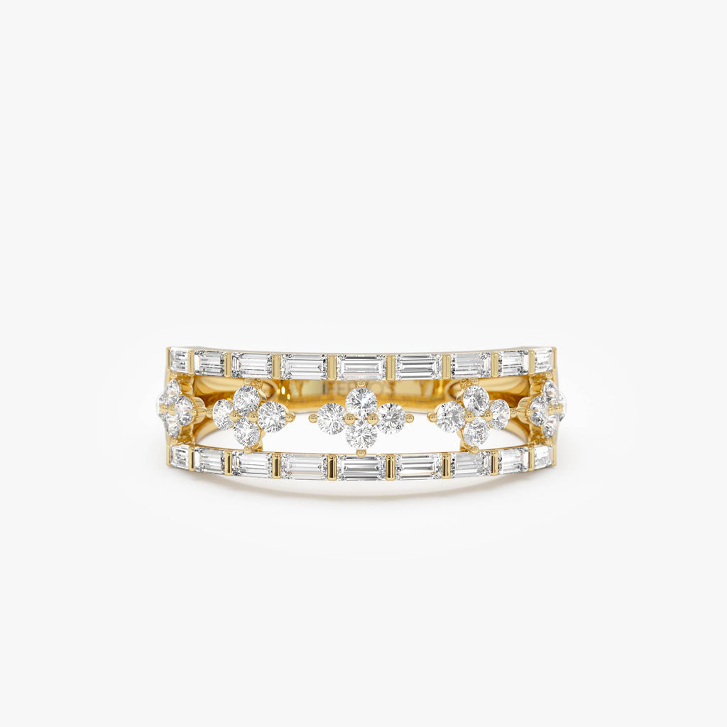 14k Wide Band Ring with Baguette and Round Diamond Cluster Accents